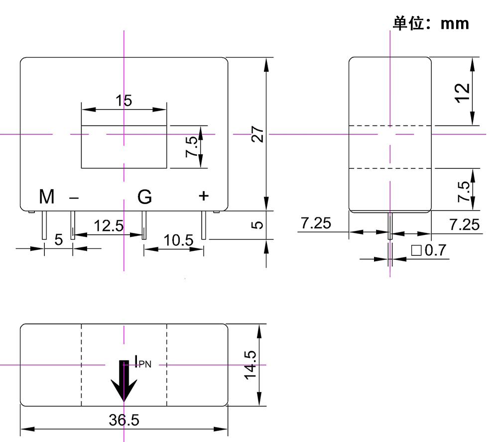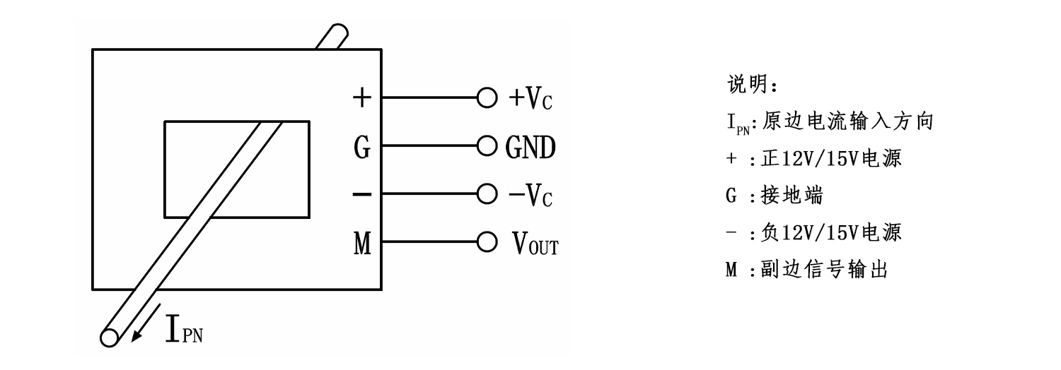 该传感器采用磁平衡霍尔电压检测原理工作。原边电流产生的磁通量与霍尔电压经过放大产生的副边电压,通过副边线圈所产生的磁通量相平衡,副边电压便能精确地反应原边电流。