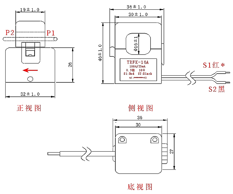 二次引线长度 1000mm 末端镀锡6~8mm 外壳 黑色尼龙
